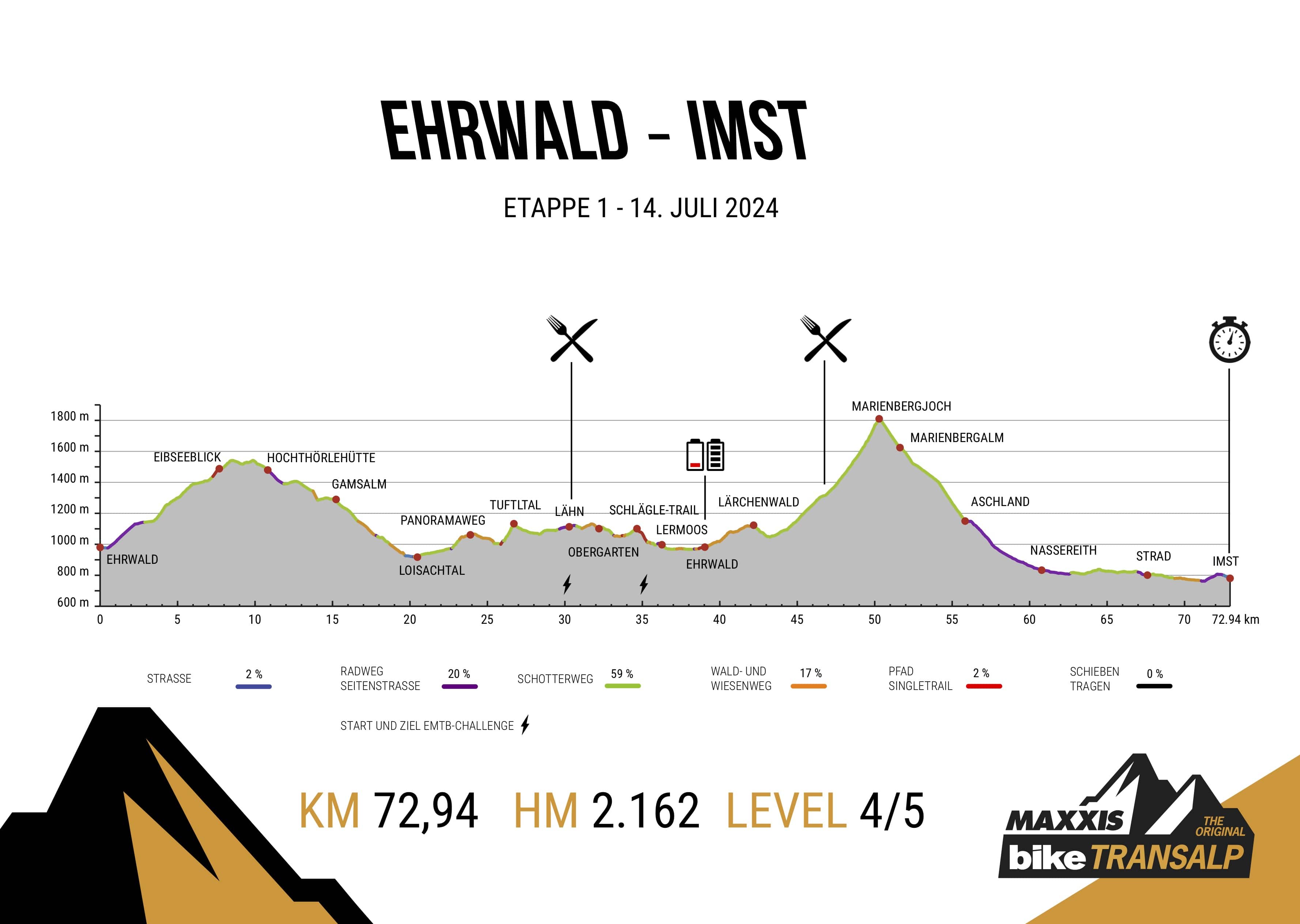 Geschafft! – kannst Du da oben aus dem letzten Loch nur pfeifen, weil es jetzt hinab geht ins Gurgltal, auf einer flotten Abfahrt auf Schotter. Bis schließlich von Nassereith schattige Wege am Waldrand flach weiter führen bis nach Imst, dem Ziel der ersten Etappe.