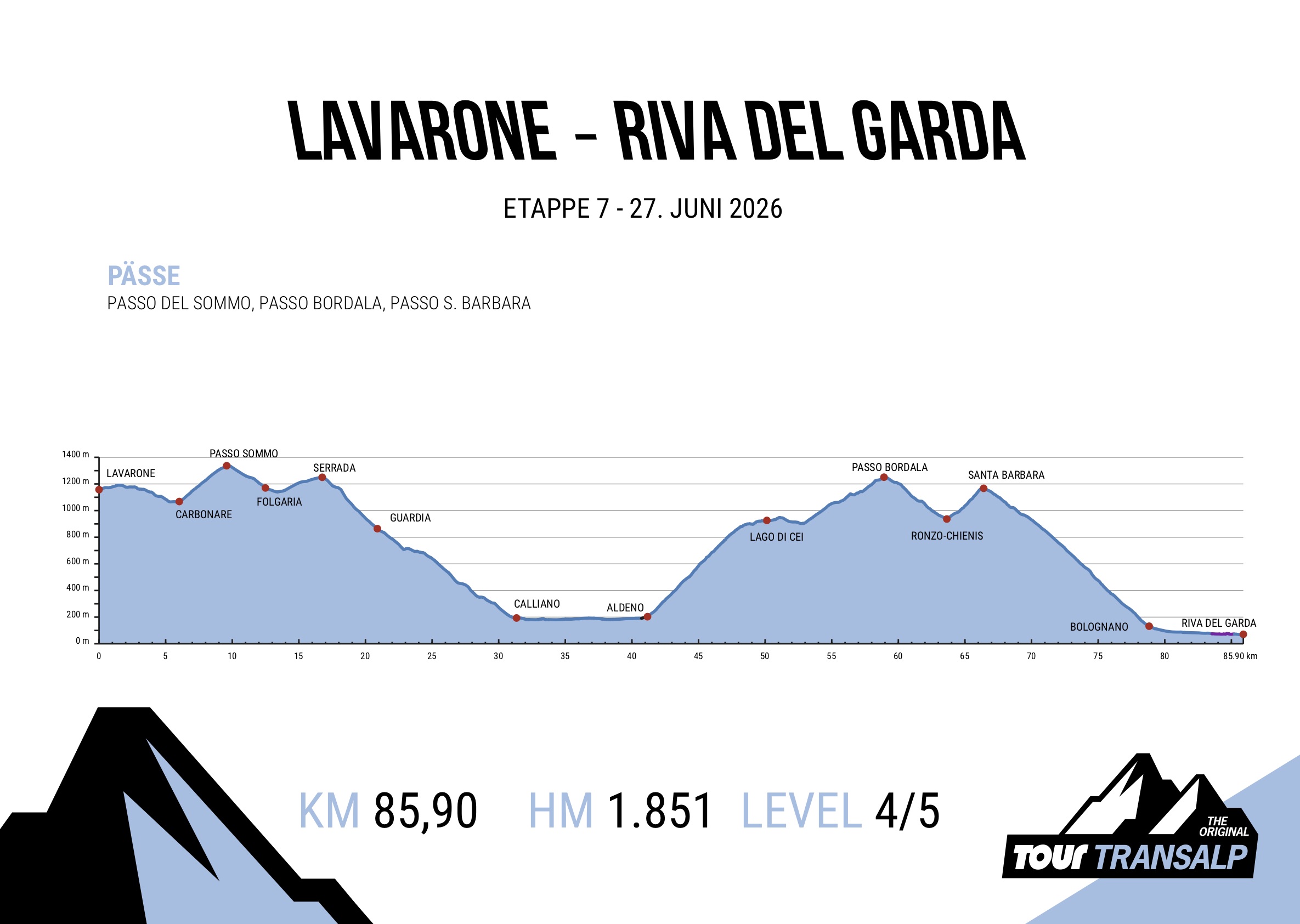 However, we do not change valleys but continue to follow the Rio Cavallo towards the Adige Valley. From Serrada, a winding road leads back down to the valley floor via the small village of Guardia, where it rejoins the main road from Folgaria after about 8 kilometres. But it is only after another 6 racy kilometres on this main road that we reach the Adige Valley floor. And after a narrow passage through the historic streets of Calliano, things calm down a bit. It's not really a lie to say it's the direct route. The main road that leads from Rovereto to Riva del Garda in the valley is absolutely impossible for a cycling event like the Transalp and even on your own bike it's pure stress in the weekend rush hour traffic. So now there is no other option but to ride over the mountain, which, to be honest, is much nicer anyway. After a short breather in the valley, the climb begins in Aldeno, past the idyllic Lago di Cei and continuing up to the Passo Bordala at an altitude of 1,251 metres. It is 1,100 metres of elevation gain from the valley to the top. So this last day also has an decent mountain test in store.