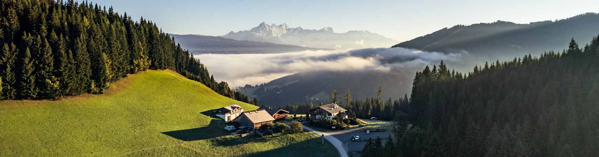 Muskeln lockern und los geht’s: Etwas mehr als 400 Höhenmeter stehen noch auf dem Programm, wenn sich der Schotterweg hinauf zum Sattelbauer windet. Der uralte Bergbauernhof thront auf dem Sattel zwischen Flachau und Altenmarkt, der Wald öffnet sich für ein paar sattgrüne Almwiesen. Und ganz besonders für den Blick zum Dachstein mit seiner Krone aus bis zu 3000 Meter hohen Felszacken. An der Grenze vom Salzburger Land zur Steiermark und zu Oberösterreich bestimmt dieser Berg hier die Kulisse. Und von wenigen Plätzen ist der Blick so betörend wie von hier. Dass der Sattelbauer natürlich eine Wirtschaft mit Terrasse hat macht die Pause an einem der angesagten Ausflug-Spots von Flachau zur Pflicht. Die Etappe ist geschafft, für die Beine zumindest. Der Kopf muss noch ein wenig wach bleiben für die kurze Abfahrt auf Straße und Fortsweg hinab ins Zentrum von Flachau.