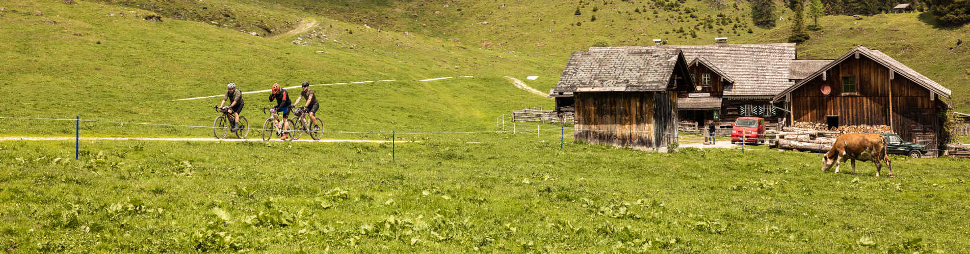Auf- und Absteigen! Augen zu und durch! Länge: rund 400 Meter. Das war’s, der Rest ist feinster Boden zum Radeln, wie zum Beispiel am ersten Berg des Tages über Altenmarkt und Radstadt: Hier warten kleine Straßen und Forstwege bester Qualität. Und ein letzter Blick hinüber zur majestätischen Krone des Dachstein-Massivs. Erst danach muss der Obertauern Pass überwunden werden. Und dafür darf dann auch mal das Rennradler-Herz schlagen, wenn einige Kilometer auf der Straße gekurbelt werden müssen – oder dürfen. Dass es aber nicht langweilig wird, dafür sorgen ein paar der feinsten Gravel Tracks der ganzen Woche. Der Taurach-Radweg räkelt sich von Radstadt nach Untertauern am Fluss-Ufer und ist ein romantisches Idyll. Der flache Weg von der Vorderen zur Hinteren Gnadenalm und weiter zum Johannesfall durchstreift ein fast kitschiges Postkartenklischee einer Almlandschaft. Zauberhaft! Und nach der Abfahrt vom Obertauern-Pass bewirbt sich der Talweg von Tweng nach Mauterndorf um die Gravel-Krone: zunächst leicht abschüssig, toll zum Cruisen, später ein wenig kupiert: eine Sensation! Er führt direkt nach Mauterndorf hinein, dessen historischer Ortskern ein kulturelles Wow-Erlebnis verspricht. Toll restauriert, 1A in Schuss gehalten, Prädikat Wertvoll. Und auch ein kurzer Abstecher zur Burg nur einen Steinwurf vom Zentrum lohnt sich. Danach heißt es Ausrollen. Meist auf dem Radweg sind es noch einige Kilometer bis St. Michael unten im Murtal. Aber auch das wird nicht langweilig. Man darf sich schon einmal mit dem Lungau vertraut machen, der Region der letzten Etappe. Sanfte Kuppen, weite Täler … aber dazu mehr bei Etappe 6.