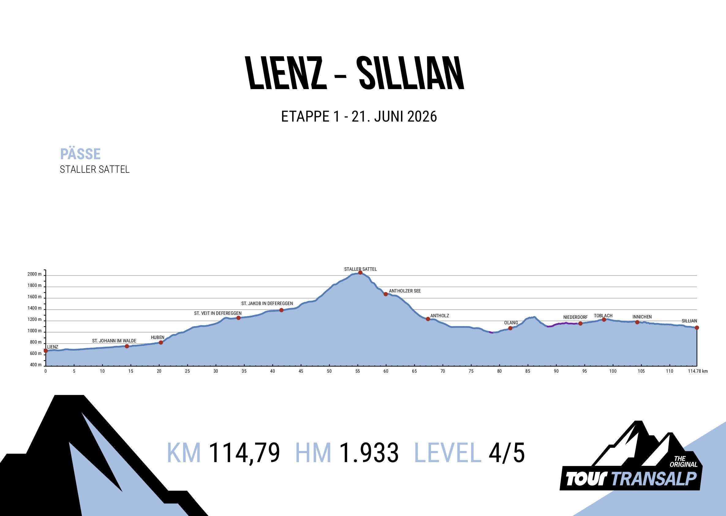 Osttirol ist in den letzten Jahren ein starker Partner der TOUR Transalp und bringt alles mit, was es für einen spannenden und attraktiven Start der Rennwoche braucht. Da sind zum einen die beiden Etappenorte Lienz und Sillian, beides Zentren der Radsportbegeisterung in dieser Region Österreichs. Und auf der anderen Seite bilden die Lienzer Dolomiten im Süden mit den Tauern und der Riesenfernegruppe im Norden eine gewaltige Kulisse für die Startetappe, die zeigt dass das „Alp“ im Namen kein leeres Versprechen ist, auf dass die Radsportler und Radsportlerinnen lange warten müssen. Für diese Ausgabe haben wir uns entschieden, die Startetappe nach 2023 wieder über den bezaubernden Staller Sattel zu führen. Dafür geht es hinein in eines der großen Täler Osttirols, das Defereggental. Das gräbt sich von Ost nach West hinein in die Berge und schafft einen Zugang zu den Hohen Tauern, deren Gipfel sich an seiner Nordflanke über 3000 Meter hinauf recken. Deshalb steht gleich zu Beginn ein Landschaftserlebnis der Ehrenkategorie auf dem Programm. Da ist noch sehr viel Natur rechts und links der Straße, besonders weiter hinten im Tal, wenn der Talschluss immer näher kommt. Auf den 35 Kilometern vom Taleingang bis zum Sattel, auf 2052 Metern Höhe, bleibt viel Zeit, Eindrücke vom Tal und von den Bergen ringsum zu sammeln. Die Größe dieses Einschnitts erweist sich zudem schnell als Vorteil, weil die 1250 Höhenmeter dieses Anstiegs dermaßen in die Länge gezogen sind, dass sich die Straße mit Steigungsprozenten dezent zurückhält. Am Staller Sattel ist auch die Grenze zu Italien erreicht und auf einer schmalen, geschwungenen Straße geht es zunächst hinab zum Biathlon-Stadion in Antholz, in dem 2026 auch die Olympischen Biathlonwettbewerbe stattfinden. Jetzt wird die Fahrt flotter, die Straße breiter – sie führt jetzt eher geradlinig hinaus in das Pustertal, nach Olang am Fuße des Kronplatz. Erst jetzt betritt die Transalp wieder bekanntes Terrain. Wenig befahrene Seitenstraßen bringen die Teilnehmer jetzt abseits der Hauptverkehrsader über einen Hügel hinüber nach Welsberg und kurz auf dem Radweg weiter nach Niederdorf. Erst jetzt geht es wieder auf die breite Staatsstraße, flach über Toblach und Innichen zurück zur Grenze. Wieder in Österreich fehlen jetzt nur noch 4 Kilometer, um die Startetappe in Sillian zu vollenden.
